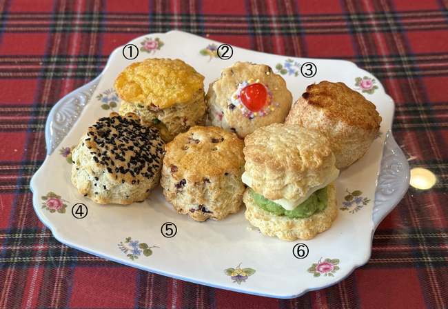 宮城県<ハムステッドティールーム>東北6県スコーンセット (1セット/6個入り) 2,500円 ※各日25セット限り 1.田子産にんにく入りカレーチーズスコーン(青森)2.さくらんぼのスコーン(山形)3.酒粕&味噌チーズスコーン(秋田)4.南部小麦の黒ごまスコーン(岩手)5.桃のクリスマススコーン(福島) 6.ずんだ餡サンドスコーン(宮城)