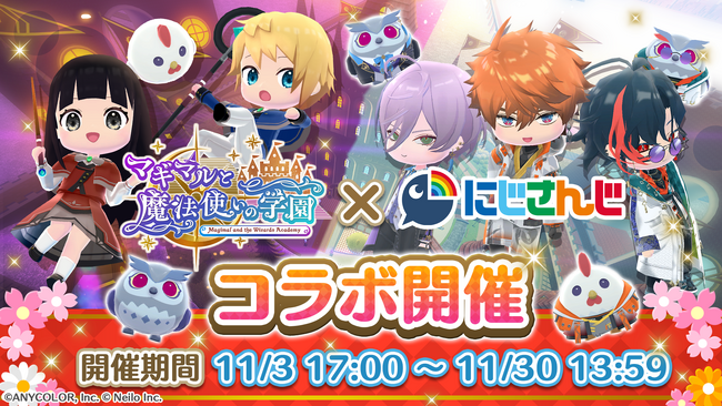 ゲーム開発やサウンド制作などを手がけるネイロ株式会社(本社:東京都新宿区、代表取締役:村澤清彰、 以下ネイロ)は、バーチャルライバーグループ「にじさんじ」所属のVTuber、北見遊征さん(@Kitami_Coolguy)、魁星さん (@Kaisei_2434) および榊ネスさん (@Ness_Sakaki) との『マギマルと魔法使いの学園』ゲーム内コラボを11月3日(月/祝)17時より開催することを発表いたします。また今回のコラボを記念し、北見遊征さん、魁星さん、榊ネスさん各YouTubeチャンネルにてコラボライブ配信を実施いたします。