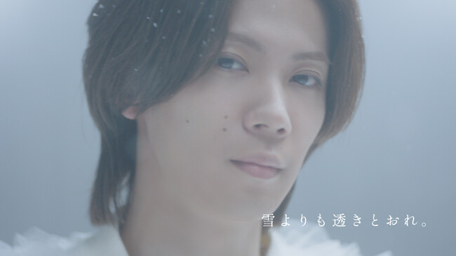 雪原から立ち上がり、静かな佇まいのNumber_i の3人が、優しく澄んだまなざしで降りしきる粉雪を見つめて、「雪よりも透きとおれ。」と、輝く雪の結晶と同化していくかのごとく、抜けるように澄みきった透明感を表現。