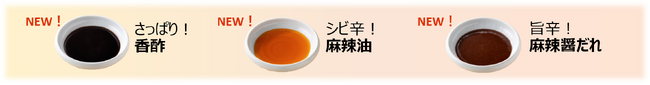 お好みカスタマイズに欠かせない!しゃぶ葉オリジナルの“味変薬味”3種[味変薬味]追加すると“さっぱり”味変の香酢と“シビ辛”に味変ができる麻辣油(マーラーユ)・麻辣醤(マーラージャン)だれでお好みの味に調整することができます。追加いただくことで、より本格的な麻辣湯をお楽しみいただけます。