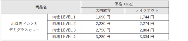 ■「肉塊オーダー制」でお好きなサイズをご注文 「ホロ肉ドカンとデミグラスカレー」は、ご注文時に肉塊レベルをお選びいただく「肉塊オーダー制」です。肉塊レベルは豚肩ロース肉の量を表しており、LEVEL1~4まで4段階のサイズをご用意しました。お好きなサイズをご注文いただき、心ゆくまで肉塊をお楽しみください。