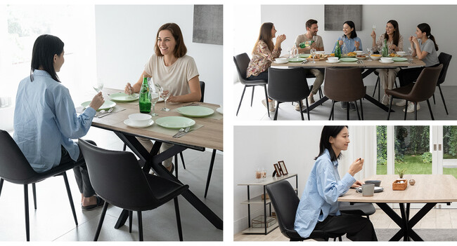 普段は大人4人掛けでもゆったり使えるサイズ。来客時には6~8人まで対応できる伸長式のダイニングテーブルです。シーンに合わせて、長さを約160cmから約200cmまで拡張できます。