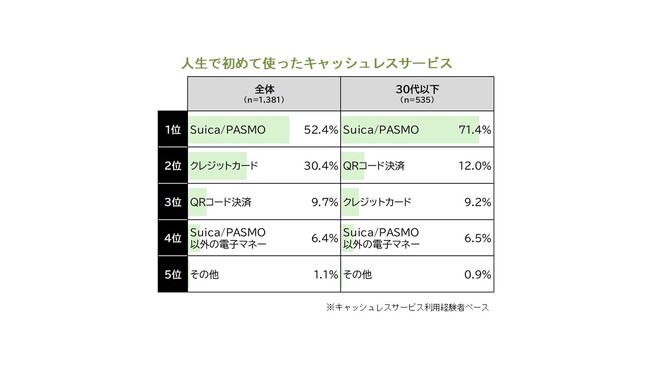 Suica/PASMOへの馴染み・安心感・信頼感キャッシュレス利用経験者における人生初利用キャッシュレスは、Suica/PASMOがトップ