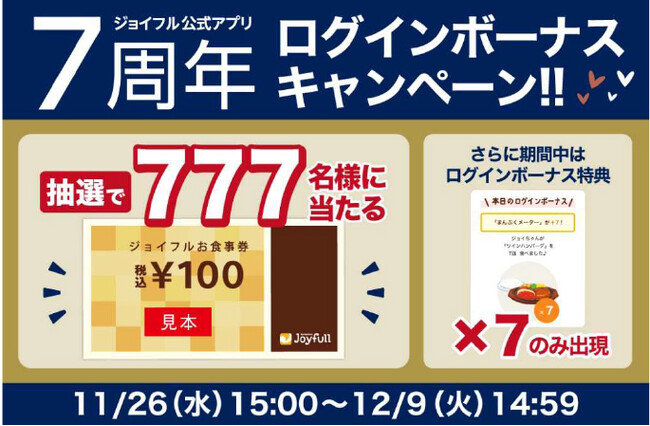 内容:1.ログインボーナス特典が「+7」のみ出現します。 2.期間中、9日間以上アプリにログインした方の中から抽選777名様に、デジタルお食事券をプレゼント。※お食事券の有効期限は2026年1月31日(土)23時59分