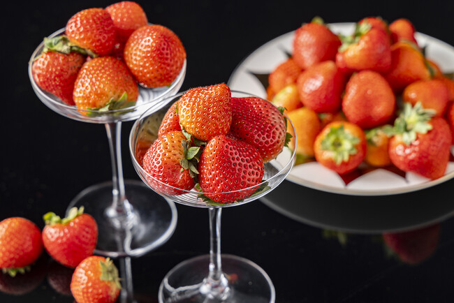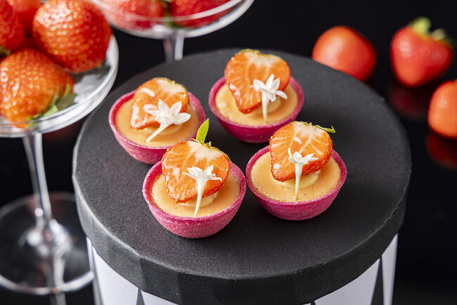 会場では、目の前で仕上げるライブステーションを設置し、2種類のストロベリースイーツをご提供します。「ストロベリークレープシュゼット」は、香ばしく焼き上げたクレープに、柚子がほのかに香るカスタードクリームを包み、温かいカラメル風味のいちごピューレをかけて仕上げる一皿。いちごの香りと酸味、カスタードの上品な甘さが絶妙なハーモニーを奏でます。「いちご大福」は、もちもちの求肥で、いちごとカスタードクリームを包み込んだ和洋折衷のスイーツ。一口で広がる素材の味と食感が、贅沢なひとときを演出します。