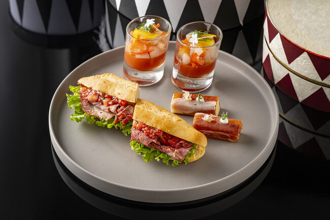 セイボリープレート(手前から順に、ビーフパストラミとストロベリーチャツネのサンドイッチ、海老のサラダとストロ)ベリーガスパチョゼリー、生ハムとブリオッシュ、ハニーコームのロール仕立て