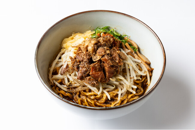 豚骨と水だけで作る濃厚スープに、背油と黒醤油を加えた超濃厚豚骨ソースが誕生。麺はスープを絡めとるような、自家製の平打ち極太ちぢれ麺を使用し、トッピングにはとろっとろ食感の煮込み豚がたっぷり乗ります!「豚味」にこだわる店主が作る渾身の一杯をお楽しみに!