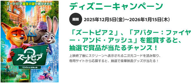 対象映画(例:「ズートピア2」「アバター:ファイヤー・アンド・アッシュ」など)をご鑑賞いただいた方を対象に、抽選で豪華映画グッズをプレゼント。