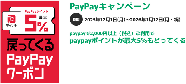 店内で合計2,000円以上(税込)をご利用の方に、PayPayポイント最大5%還元。
