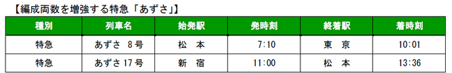 2.中央線特急「あずさ」の編成両数を増強します ご利用が見込まれる土休日に、特急「あずさ8号」および「あずさ17号」の編成両数を9両から12両とし、着席サービスを向上します。