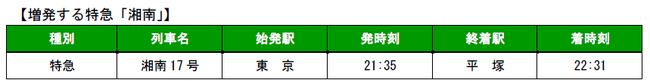 ※現在の東京駅22時00分発「湘南17号」は、22時00分発「湘南19号」に変更します。