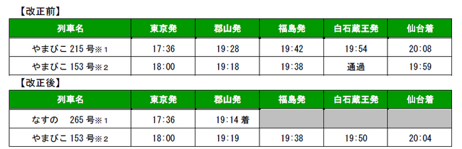 ※1「やまびこ215号」は、運転区間変更のため、「なすの265号」に変更します。