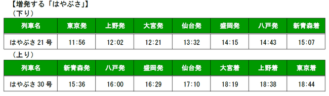 I.新幹線1. 東北新幹線「はやぶさ」を増発します 下りは東京駅11時台発の「はやぶさ」を増発し、東京駅7~11時台発の時間帯は「はやぶさ」を毎時2本以上運転します。上りは現在盛岡発東京行きとして運転している東京駅18時台着の「はやぶさ」の始発駅を新青森駅に変更します。