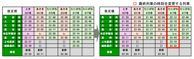 ※「たにがわ417号」は改正後より、本庄早稲田駅を通過します。なお、「とき329号(17:02着)」は改正後より