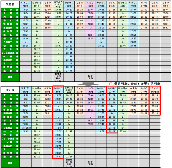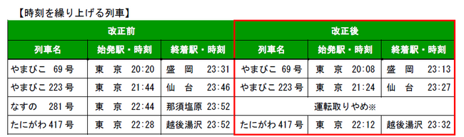 5.夜間作業時間拡大のため、東北・上越新幹線で最終列車の時刻を繰り上げます 開業から40年以上が経過し、老朽化が進む設備のリニューアル工事や地震対策工事が必要なため、東北新幹線東京~盛岡間、上越新幹線高崎~越後湯沢間の下り最終列車の時刻を繰り上げます。また、夜時間帯のご利用状況から一部列車の運転取りやめや停車駅の見直しを行います。