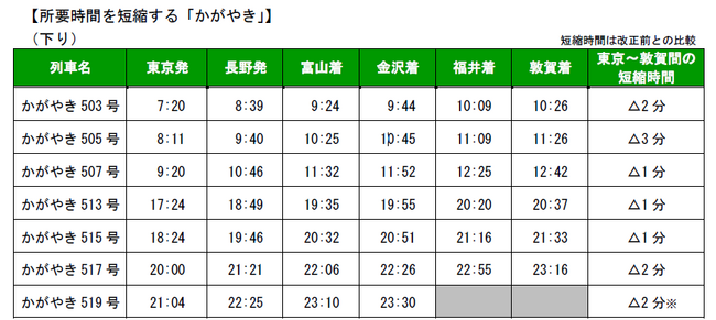 ※「かがやき519号」は金沢行きのため、東京~金沢間の短縮時間となります。