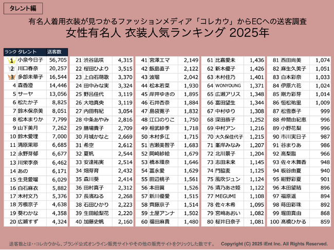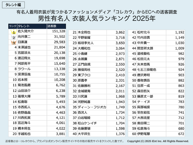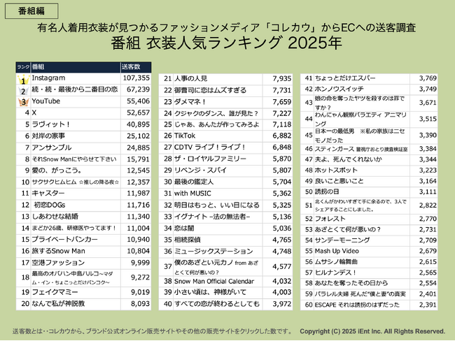 OMO(Online Merges with Offline)ソリューションを手掛けるアイエント株式会社(本社:東京都渋谷区神宮前、代表取締役 大森智人)は、ファッションに特化したEC支援やPRプラットフォームを開発・運営しており、自社サービス「コレカウ(有名人の着用衣装が見つかるファッションメディア)」のデータをもとに、2025年にテレビやSNSで注目を集めたタレント・番組・ブランドのファッション人気ランキングを発表しました。