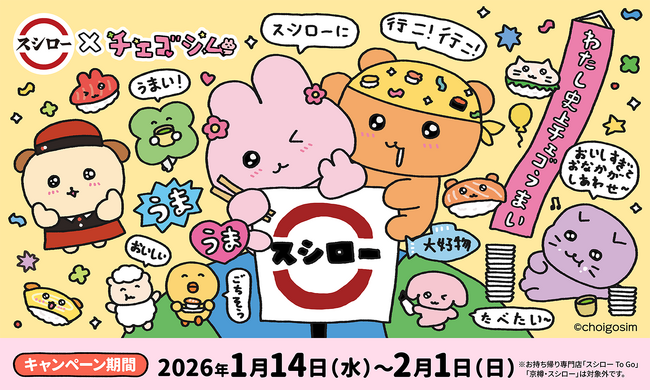 CHOCOLATE Inc.(本社:東京都渋谷区、代表取締役:渡辺裕介)は、弊社が日本展開を手がける韓国発キャラクター「チェゴシム(최고심)」と、株式会社あきんどスシロー(本社:大阪府吹田市、代表取締役社長:新居耕平)が展開するスシローとのコラボキャンペーンが、1月14日より全国のスシロー(※1)にて実施されることをお知らせいたします。