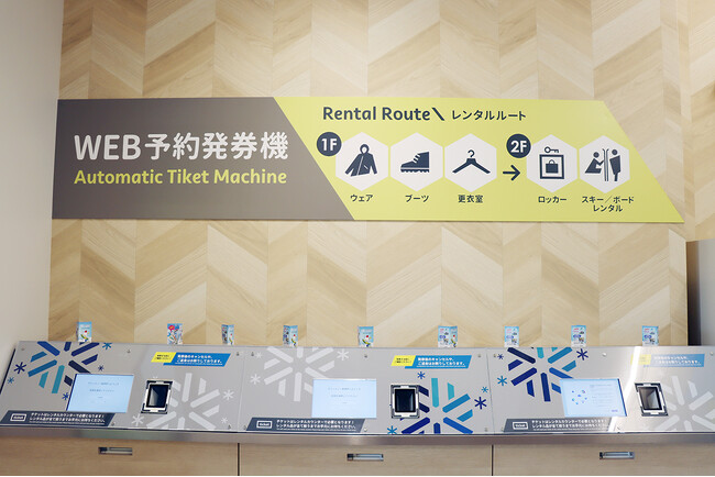 また、レンタルハウス内にもリフトチケットの「自動券売機2台」(クレジット対応専用機)を新設。リフトチケットは「アジア初導入の自動改札機」ともスムーズな連携が出来て「”ストレスフリーな1日の実現”」をして、利用者の満足度向上にも繋がっています。