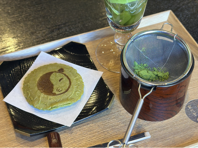 濃厚な抹茶パフェをさらに濃厚にできる追い抹茶と、お持ち帰りもできる京煎堂の抹茶生煎餅を無料でプレゼント。