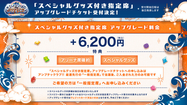 「スペシャルグッズ付き指定席」アップグレード チケット受付も決定!アンプタックラブ!!最速先行受付で「一般指定席」チケットを当選後、ご入金された方を対象に、「スペシャルグッズ付き指定席」へのお申込みを後日受け付け、抽選する方法です。当選された場合、「一般指定席」チケットはアップグレード料金として1枚につき6,200円(税込)+手数料をお支払いいただきます。