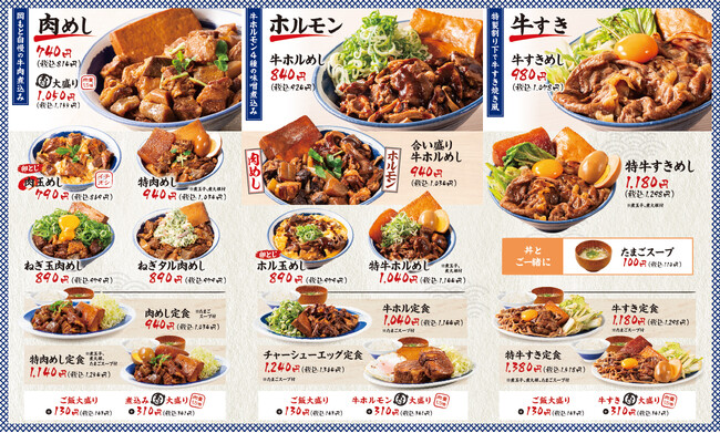 看板メニュー「肉めし」をはじめ、味噌で煮込んだ牛ホルモン、特製割り下で仕上げた牛すきなど豊富なラインナップを展開。