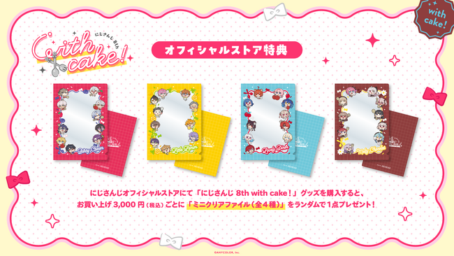にじさんじオフィシャルストアにて「にじさんじ 8th with cake!」グッズを購入すると、お買い上げ3,000円(税込)ごとに「特典ミニクリアファイル(全4種)」をランダムで1点プレゼント!