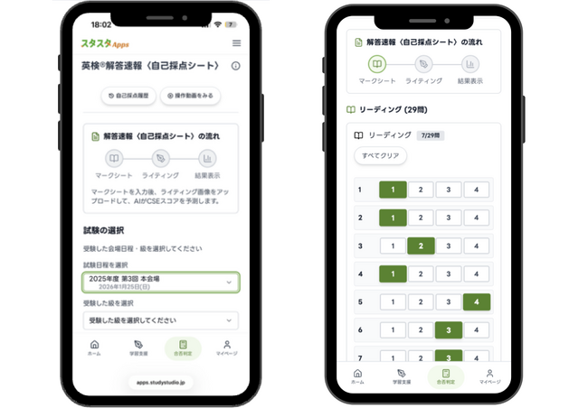 英検(R)対策Webアプリ「スタスタApps」(運営:スタディスタジオ株式会社)は、英検(R)2025年度第3回一次試験の解答速報に対応し、本会場および準会場D/E/F日程の解答速報(2026年1月26日(月)13:00以降に協会公式サイトへ掲載予定)について、掲載を確認後、解答速報〈自己採点シート〉へ順次反映します。