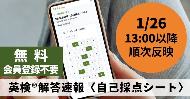 英検(R)解答速報公開(1/26 13:00以降)に合わせ、スタスタAppsが自己採点シートを順次反映