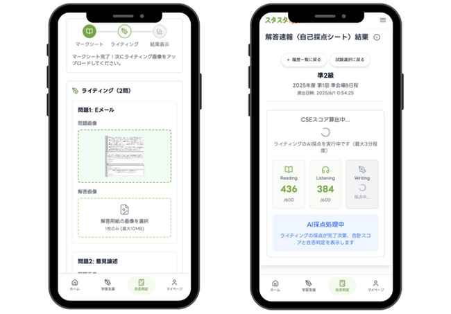 スタスタAppsの「解答速報〈自己採点シート〉」は、英検(R)一次試験の解答速報をもとに、Reading/Listening/Writingをまとめて自己採点できる無料機能です。Reading/Listeningは選択肢入力で採点、Writingは解答をアップロードして採点し、CSEスコア推定や合否の目安を確認できます。