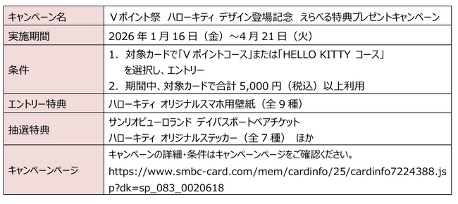 本キャンペーンでは、対象カードでエントリーすると、ハローキティのオリジナルスマホ用壁紙(全9種)がもれなくもらえるほか、条件達成で、抽選でサンリオピューロランド デイパスポートペアチケットやハローキティ オリジナルステッカー(全7種)など、ここでしか手に入らない限定アイテムも当たります。その他に選べる特典としてVポイントもご用意しており、当選数は総勢100万名以上と、多くのお客さまに当選のチャンスがございます。この機会にぜひエントリーください。