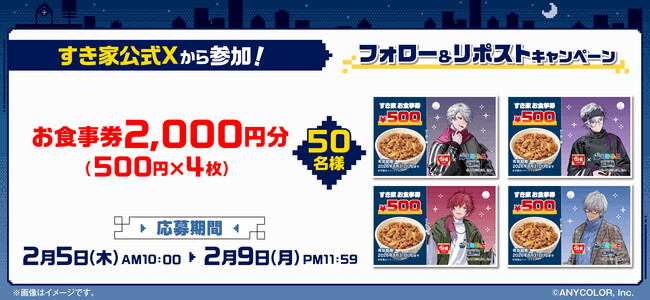 【すき家】2月5日(木)より「すき家」が『にじさんじ』“せめ4”とコラボキャンペーンを開催!対象メニューを注文するとオリジナルカードがもらえるなど、企画が盛り沢山!