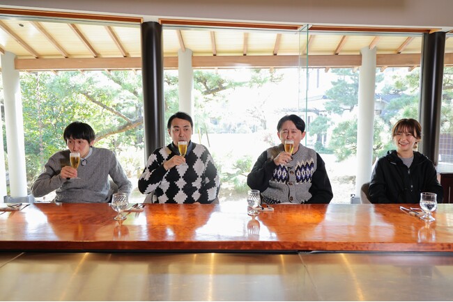 つづいて訪れたのは、尾道を代表する名門旅館「西山別館」がモダンな姿にリニューアルした「Ryokan尾道西山」です。戦前から政財界人や皇族方をもてなしてきた格式あるお宿は再出発後、ミシュランキーに2年連続で選出。そんな名宿で一行は、東京・パリ・京都の名門フレンチを経て広島県へ帰ってきたというシェフ渾身の料理に舌鼓を打ちます。そして、男性陣は露天風呂まで満喫。
