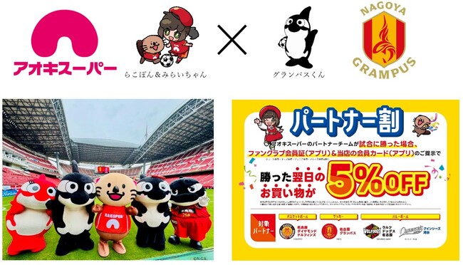 アオキスーパーは、昨シーズンに続き、名古屋グランパスのファンクラブ会員(ジュニア会員を除く)&アオキスーパーのポイントカード会員を対象に試合(リーグ戦)に勝利した翌日のお買い物が5%OFFになる『パートナー割』を実施いたします。