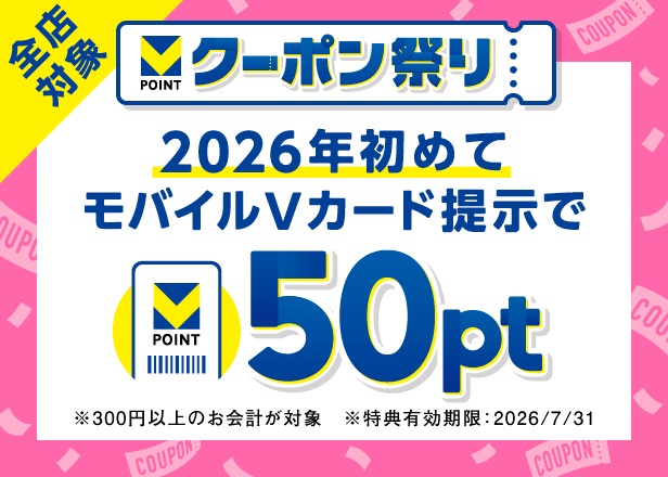 ※1 キャンペーン期間中にクーポンセット後、モバイルVカードの提示で300円(税抜・値引き後)以上貯まるお会計が対象です。