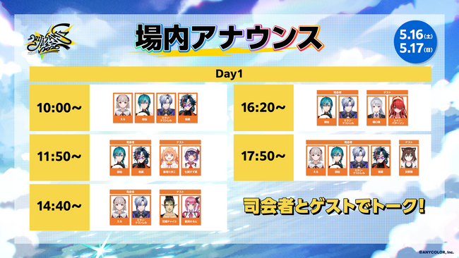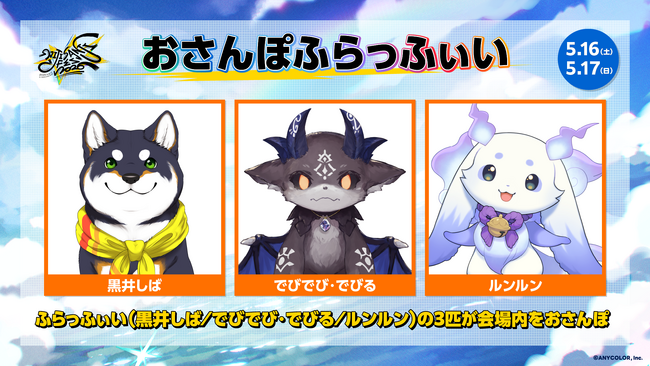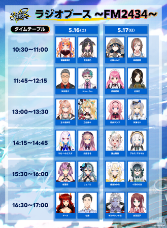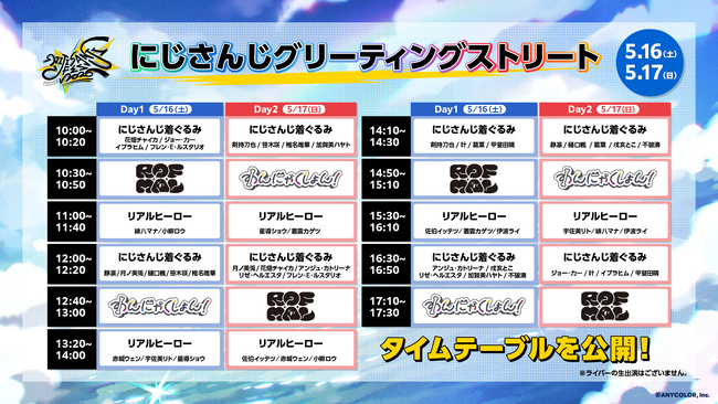 さらに、大人気の着ぐるみ&リアルヒーローが登場する「にじさんじグリーティングストリート」および、「ラジオブース~FM2434~」のスケジュールも公開!会場を余すことなく楽しめる魅力が満載となっています。