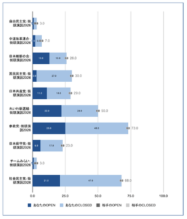 知識表現AIを用い、会話・文章情報から組織課題を可視化するコグニティ株式会社(本社:東京都品川区、代表取締役:河野理愛、以下「コグニティ」)は、2026年2月8日投票日の衆院選に向けて、各党の街頭演説(10党・全419分)を対象に、主張の“中身”だけではなく、伝え方の“型”を定量化する分析を実施しました。
