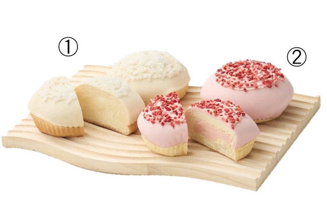 <みんなの大ぱん>1.ミルククリーム入り白いメロンパン 2.いちごクリーム入り赤いメロンパン (1個) 各540円 ※各日各200個限り
