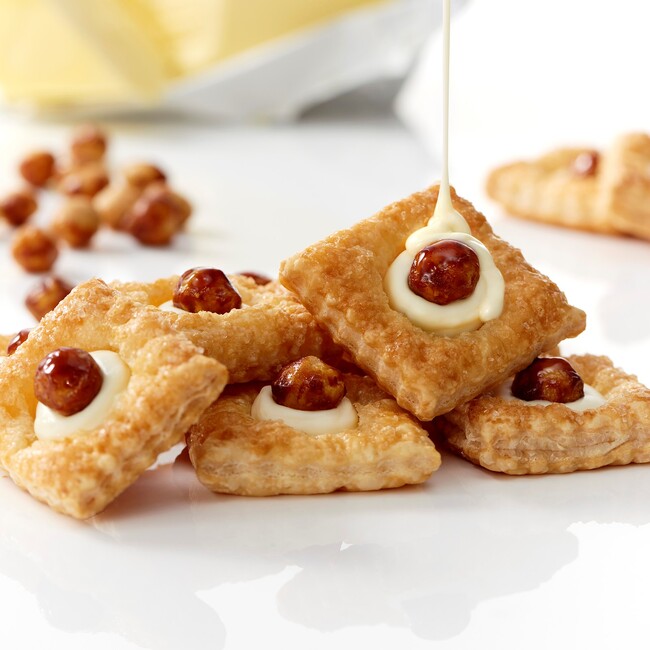 メープルシュガーを振りかけて焼き上げたバターが香るパイに、ホワイトチョコのクリームを絞り、キャラメリゼしたマカダミアナッツをトッピング。