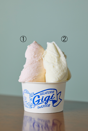 <ジェラテリア ジジ>ジェラートダブル (1カップ) 851円(1.たおか農園のストロベリー2.恵庭・水本牧場産のミルク)