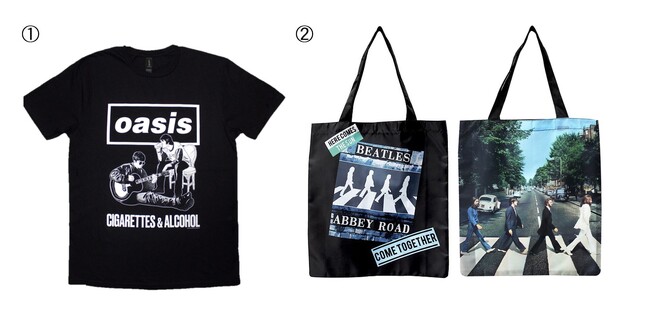 【ショージ】1.<oasis>Tシャツ(S~XLサイズ) 5,500円 ※50着限り 2.<The Beatles>エコバッグ ※エコバッグケース付 2,970円