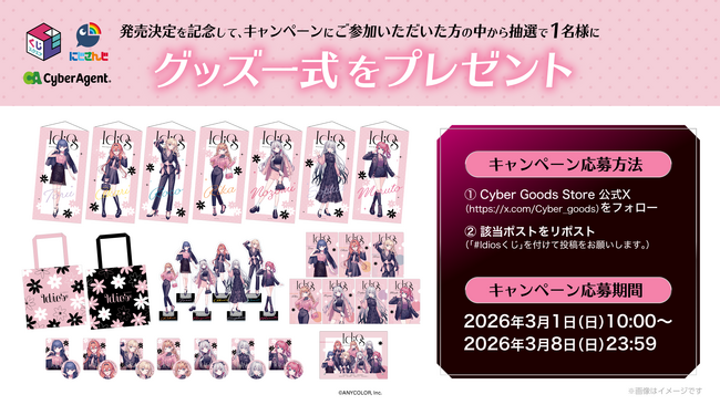 株式会社サイバーエージェント(本社:東京都渋谷区、代表取締役:山内隆裕、東証プライム市場:証券コード4751)が展開するリアルくじブランド「くじスクエア」は、VTuberプロジェクト/バーチャルライバーグループ「にじさんじ」に所属するユニット「Idios」のオリジナルグッズが景品として当たる『くじスクエア Idiosくじ』を、2026年3月1日(日)より発売いたします。