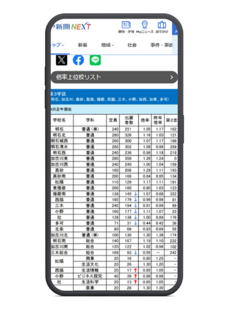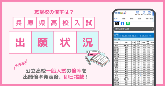 高校入試の情報収集は神戸新聞NEXTで!神戸新聞NEXTでは、出願状況速報に加えて、兵庫県内すべての高校のニュースを学校ごとにまとめた「ひょうごの高校」や、公立高校の過去10年間の倍率をグラフで確認できる「過去10年間の倍率」、「過去問題と解説」など、高校入試に関するコンテンツを幅広く掲載しています。