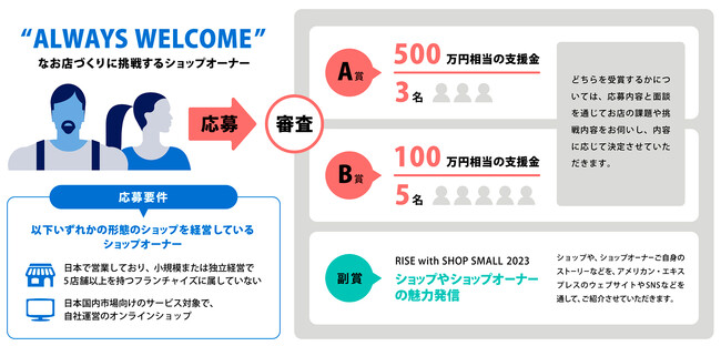 アメリカン・エキスプレス・インターナショナル, Inc.(本社:東京都港区、以下、アメリカン・エキスプレス)は、中小店舗経営者(スモールショップオーナー)支援の取り組みとして世界中で実施している「SHOP SMALL(R)」*1の日本における展開として、「RISE with SHOP SMALL 2023」(ライズ・ウィズ・ショップスモール 2023)の募集を、2023年6月29日(木)より開始いたします。RISE with SHOP SMALLは、2022年に続く2年目となる取り組みで、今年は“ALWAYS WELCOME”をテーマとし、多様性に配慮したオープンなお店作りに挑戦するショップオーナーへ、最大500万円相当 (総額2000万円相当) の支援を提供します。