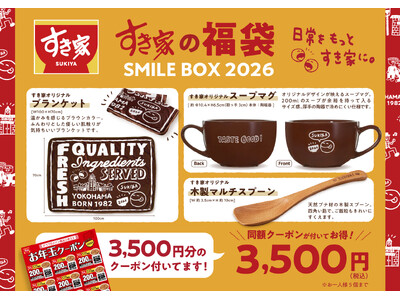【すき家】すき家の福袋「SMILE BOX 2026」発売決定!お得なクーポンと寒い季節にぴったりのグッズで、日常をすき家色に!