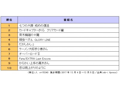 2018年冬アニメ番組の視聴意向ランキングを発表!~エンタメ消費者動向の定期サービス『eb-i Xpress』~