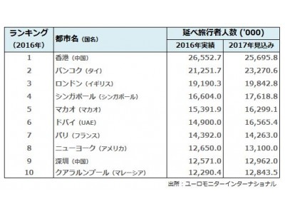 ユーロモニター『世界の観光都市Top100 2017版』を発表