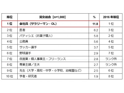 全国の小中学生1,000人を対象にした「将来就きたい仕事」に関する調査:男子の1位は「会社員」、女子の1位は「パティシエ」