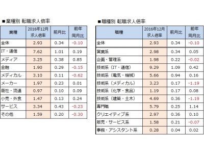 2016年12月 転職求人倍率 2.93倍(前月比+0.34pt)~求人数は25カ月連続で最高値。2017年の転職市場はさらに活況へ~