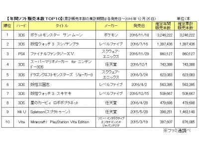 2016年国内家庭用ゲーム市場規模は2994.8億円。「ポケットモンスター サン・ムーン」がトリプルミリオンでソフト首位。~「ファミ通」マーケティング速報~